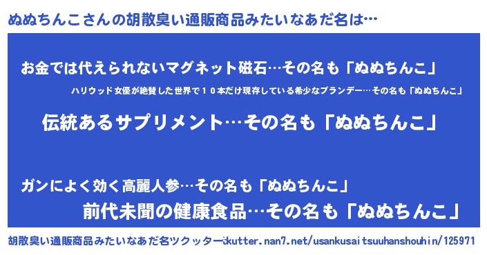 | 男性向けラノベタイトル風あだ名 | 『転生したらぬぬちんこだった件』 |