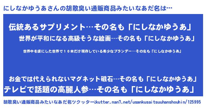 | 意味不明あだ名 | 『住所不定無職にしなかゆうあ(95歳)』 |