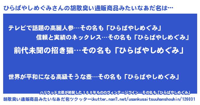 | ヘコむあだ名 | 『ひらばやしめぐみ(笑)』『ひらを』 |