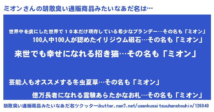 | 意味不明あだ名 | 『永久保存ミオン』『ペロリンミオン』 |