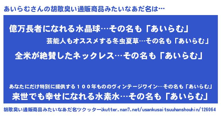 | 男性向けラノベタイトル風あだ名 | 『あいらむに滅ぼされるだけの簡単なお仕事です』 |