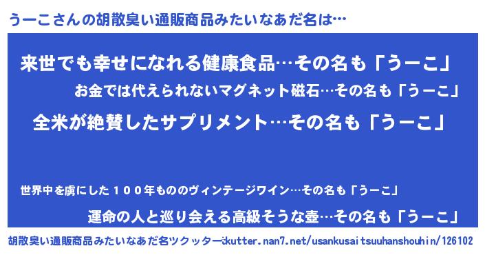 | 意味不明あだ名 | 『とにかく怪しいうーこ』 |