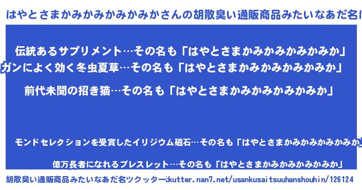 | 男性向けラノベタイトル風あだ名 | 『うちのはやとさまかみかみかみかみかが世界を掌握している!』 |