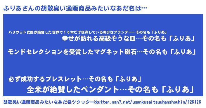 | ヘコむあだ名 | 『ふりお』『つくし』『ふりっふぃ~』 |