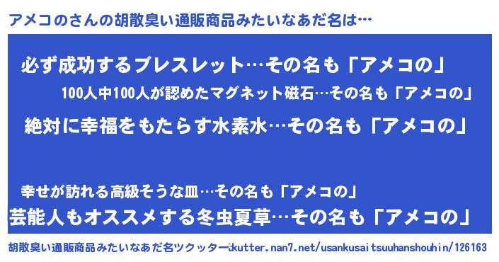 | ヘコむあだ名 | 『アメコの(震え声)』『アメふぇ~』 |