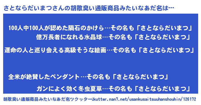 | 男性向けラノベタイトル風あだ名 | 『うちのさとならだいまつが世界を掌握している!』 |