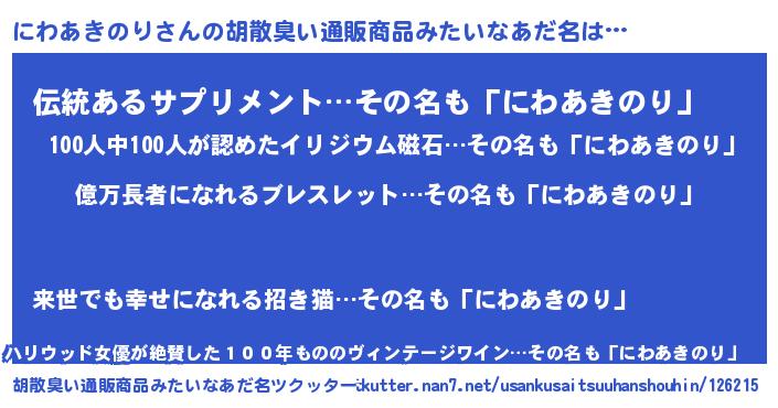 | 恥ずかしいあだ名 | 『プリティーにわあきのり』『にわちん』 |