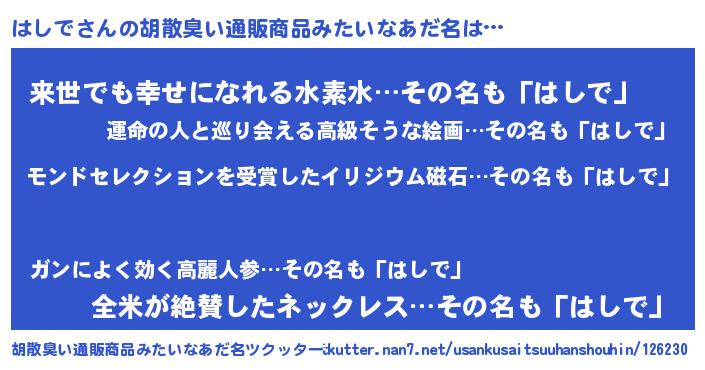 | ヒーロー風カッコイイあだ名 | 『慈愛の使者はしで』『ネオハシデ』 |