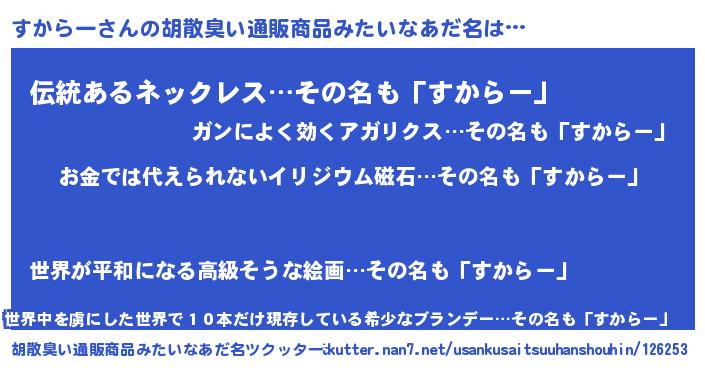 | 男性向けラノベタイトル風あだ名 | 『転生したらすからーだった件』 |