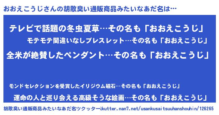 | 男性向けラノベタイトル風あだ名 | 『おおえこうじ~年齢イコール彼女いない歴の魔法使い~』 |
