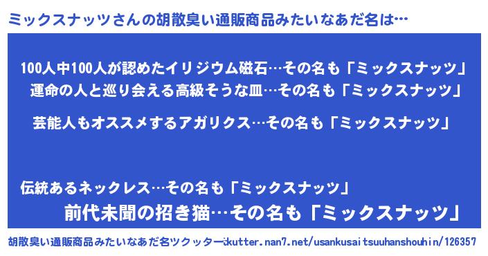 | 男性向けラノベタイトル風あだ名 | 『Re:ミックスナッツから始める異世界生活』 |