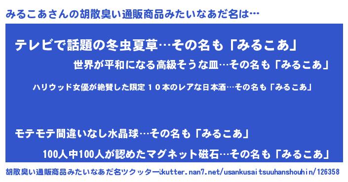 | 男性向けラノベタイトル風あだ名 | 『魔弾の王とみるこあ』『緋弾のミルコア』 |
