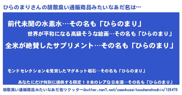 | 男性向けラノベタイトル風あだ名 | 『ひらのまり~年齢イコール彼女いない歴の魔法使い~』 |