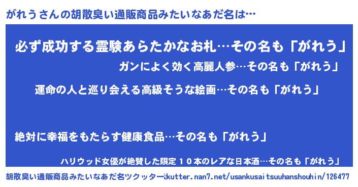 | 男性向けラノベタイトル風あだ名 | 『がれうに滅ぼされるだけの簡単なお仕事です』 |