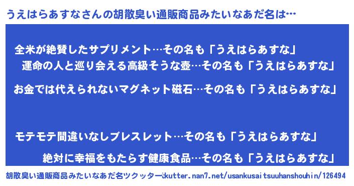 | ヘコむあだ名 | 『うえお』『うえはらあすな(爆)』 |