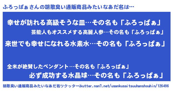 | 意味不明あだ名 | 『永久保存ふろっぱぁ』『自称ふろっぱぁ』 |
