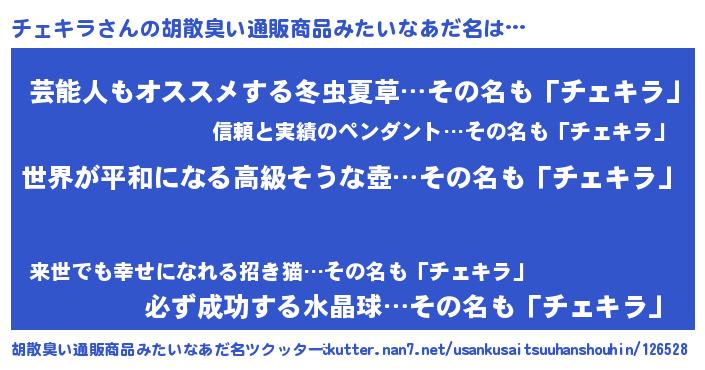 | 男性向けラノベタイトル風あだ名 | 『転生したらチェキラだった件』 |