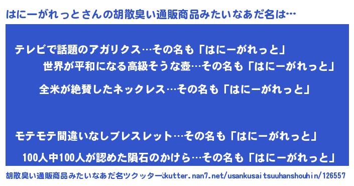 | ヘコむあだ名 | 『はにっぺ』『なまこ酢』『はにもー』 |