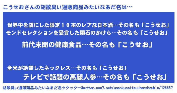 | 意味不明あだ名 | 『永久保存こうせお』『自称こうせお』 |