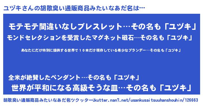 | 意味不明あだ名 | 『住所不定無職ユヅキ(89歳)』 |