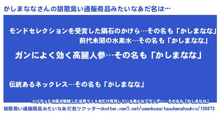 | ヘコむあだ名 | 『かしまなな(小並感)』『かしぷりん』 |
