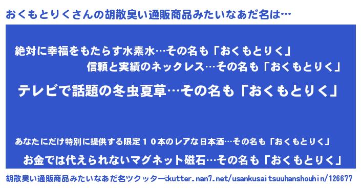| ヘコむあだ名 | 『おくもとりく(苦笑)』『おくっちょ』 |