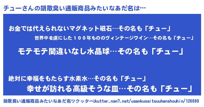 | ヘコむあだ名 | 『チュにゅー』『なまこ酢』『チュお』 |