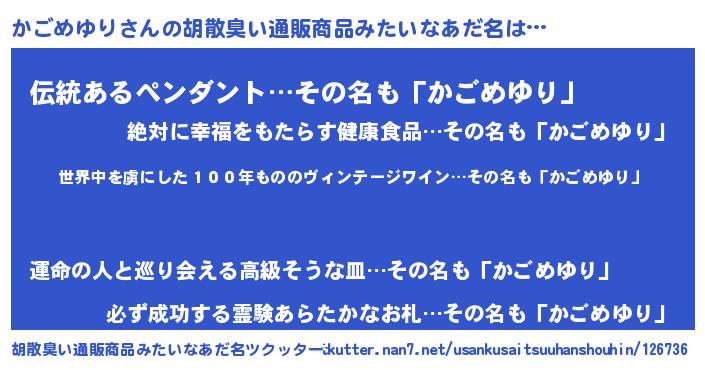 | 意味不明あだ名 | 『住所不定無職かごめゆり(2歳)』 |