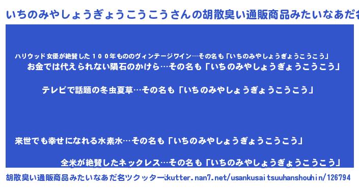 | 男性向けラノベタイトル風あだ名 | 『転生したらいちのみやしょうぎょうこうこうだった件』 |