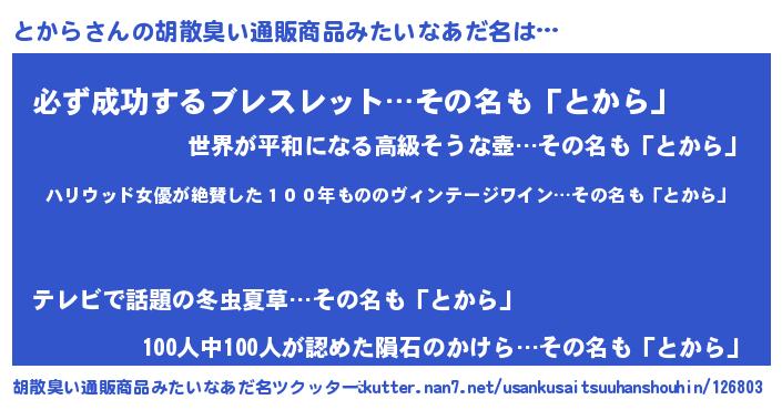 | 意味不明あだ名 | 『住所不定無職とから(9歳)』『自称とから』 |