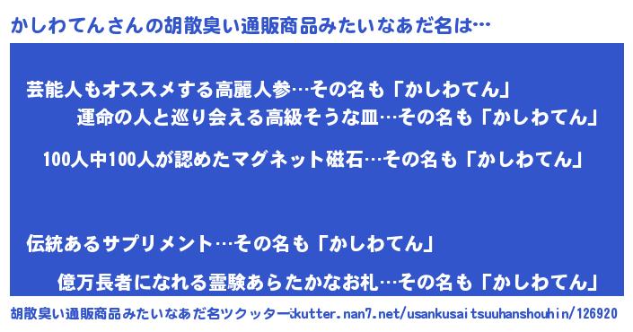 | ヒーロー風カッコイイあだ名 | 『正義の使者かしわてん』『黄金騎士カシ』 |
