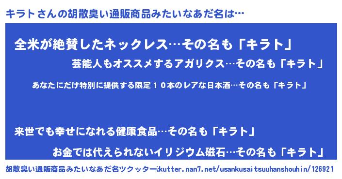 | 男性向けラノベタイトル風あだ名 | 『この素晴らしい世界にキラトを!』 |