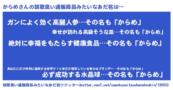 | 意味不明あだ名 | 『永久保存からめ』『自称からめ』 |