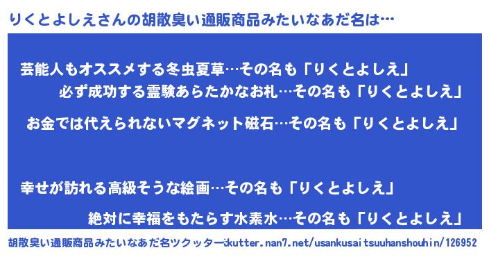 | ヘコむあだ名 | 『りくとよしえ(笑)』『りくっふぃ~』 |