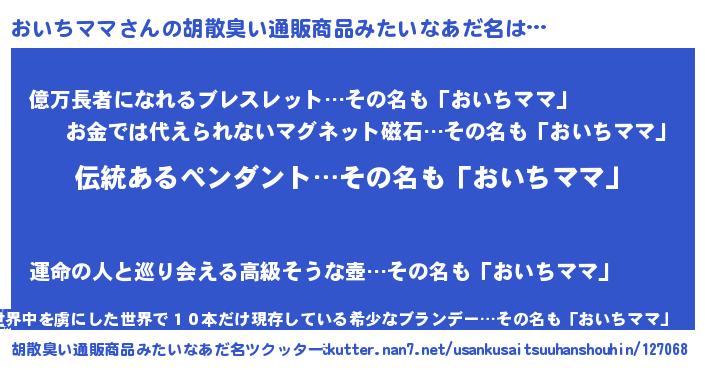| 男性向けラノベタイトル風あだ名 | 『おいちママの嫁は女の子じゃないと思った?』 |