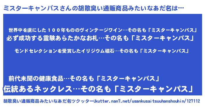 | 意味不明あだ名 | 『眠気覚ましガムミスターキャンパス味』 |