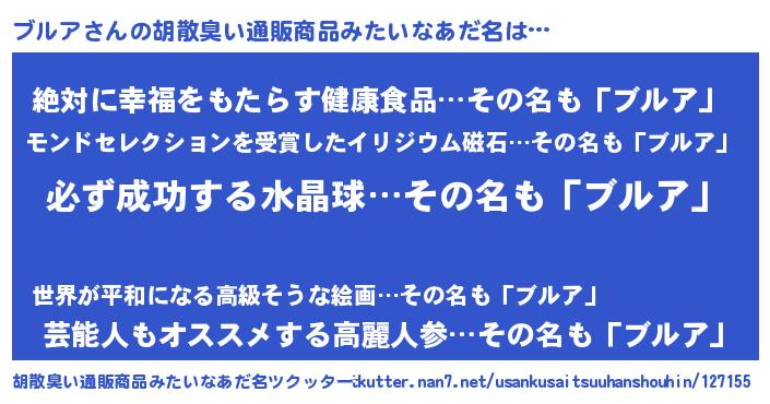| 男性向けラノベタイトル風あだ名 | 『ブルアの憂鬱』『魔法科高校のブルア』 |