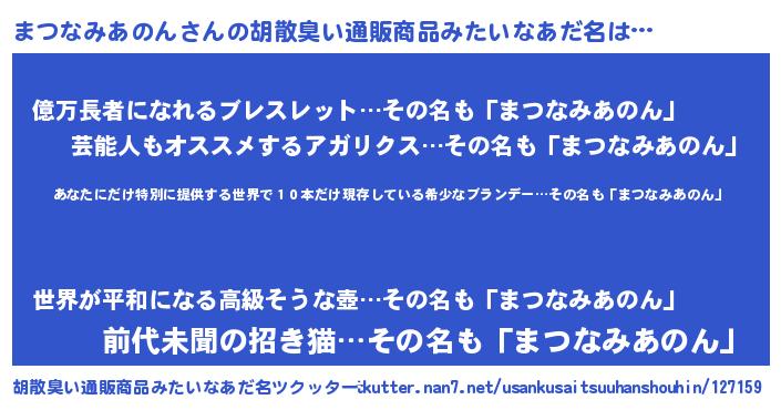| 意味不明あだ名 | 『住所不定無職まつなみあのん(81歳)』 |