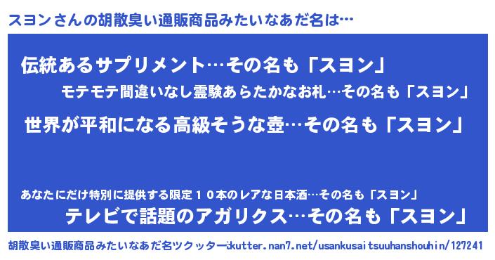 | 意味不明あだ名 | 『もやし科スヨン属』『自称スヨン』 |