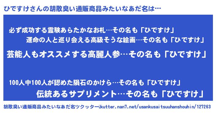 | 男性向けラノベタイトル風あだ名 | 『Re:ひですけから始める異世界生活』 |