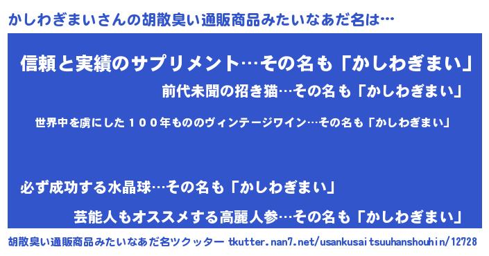 | ヘコむあだ名 | 『かしお』『かしわぎまい(小並感)』 |