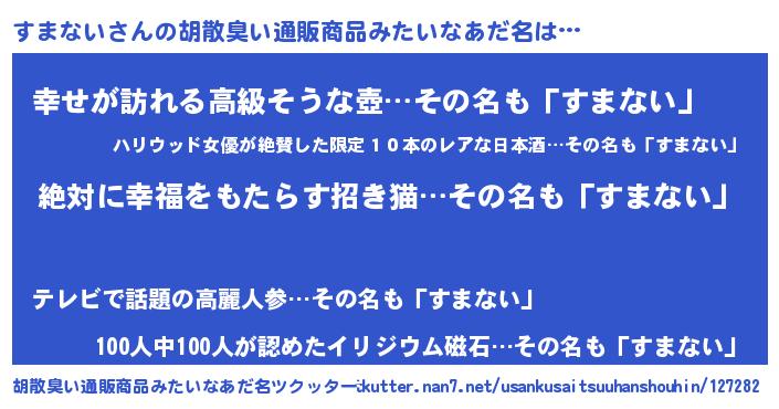 | ヒーロー風カッコイイあだ名 | 『ネオスマナイ』『ウルトラすまないマン』 |