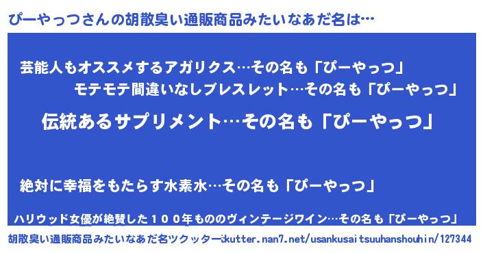 | 男性向けラノベタイトル風あだ名 | 『ダンジョンにぴーやっつを求めるのは間違っているだろうか』 |