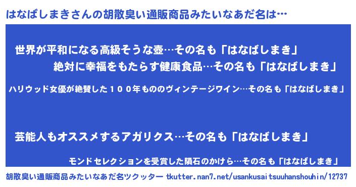 | 意味不明あだ名 | 『住所不定無職はなばしまき(13歳)』 |