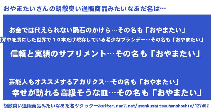 | 男性向けラノベタイトル風あだ名 | 『ダンジョンにおやまたいを求めるのは間違っているだろうか』 |