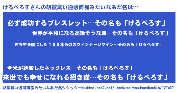 | 意味不明あだ名 | 『住所不定無職けるべろす(9歳)』 |
