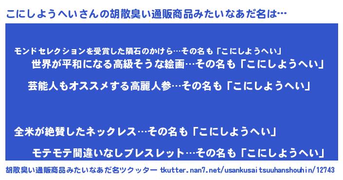 | 意味不明あだ名 | 『自称こにしようへい』 |