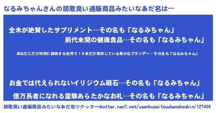 | 男性向けラノベタイトル風あだ名 | 『なるみちゃんに滅ぼされるだけの簡単なお仕事です』 |