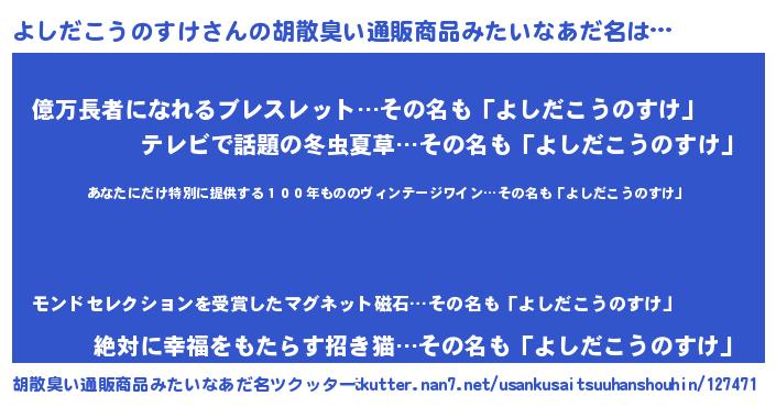 | 意味不明あだ名 | 『住所不定無職よしだこうのすけ(6歳)』 |