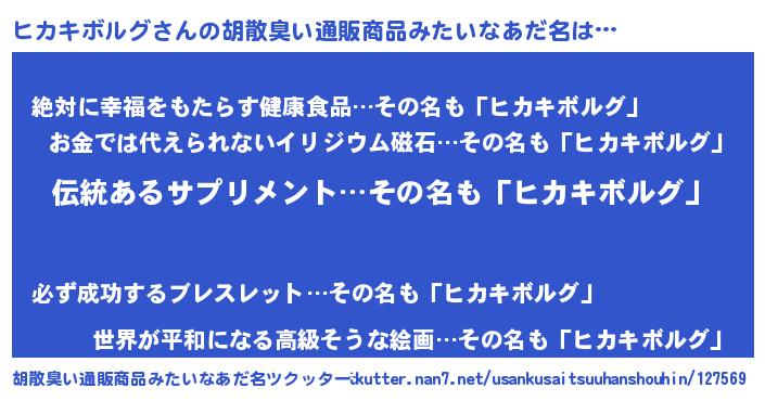 | 女子向けラノベタイトル風あだ名 | 『ヒカキボルグの卵を拾いまして』 |